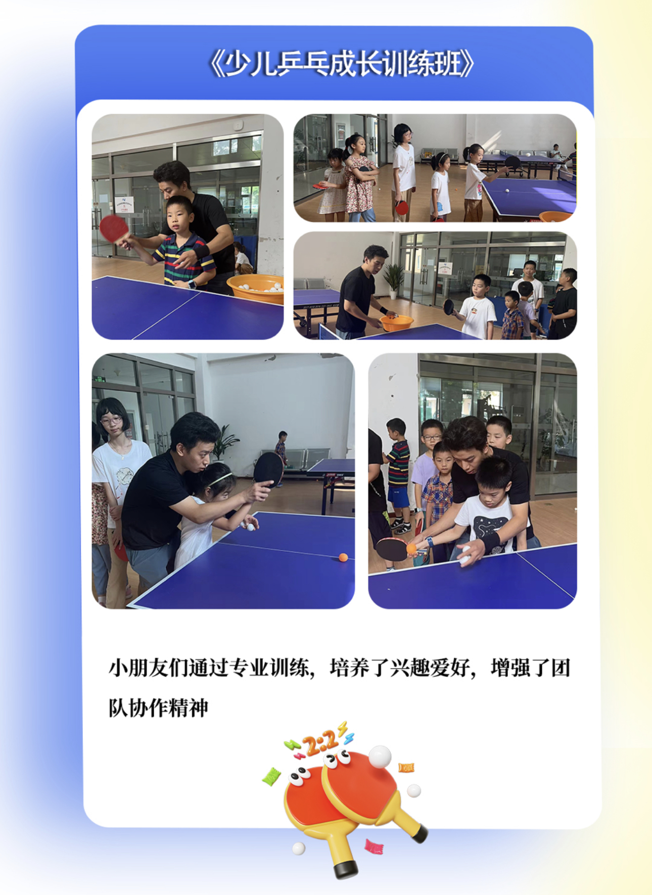 夏令营历时十天,精心设置了两大项目,一是“童梦飞扬欢乐营”,通过多样化的参与和锻炼,旨在提升孩子的综合能力素质;二是“少儿乒乓成长特训班”,为孩子们搭建特训平台,专注于培养孩子乒乓球专项能力及兴趣。为确保两项活动的顺利进行,中心工会为孩子们准备了丰富的运动器材、美术手工素材、少儿书籍、益智玩具等,充分满足孩子们多样化的需求。同时,聘请专业老师进行看护和教学,设计了兼具知识性、趣味性和专业性的课程体系,让孩子们在暑期夏令营活动中度过了一段充实而愉快的假期时光。