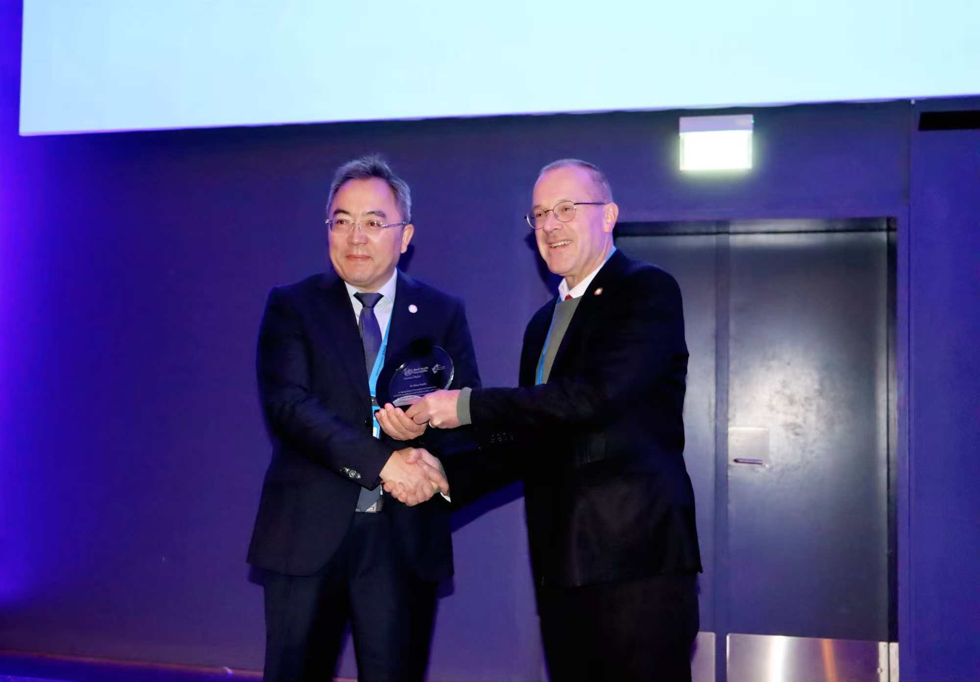 会议期间,UNION副主席暨WHO欧洲区负责人汉斯·克鲁格(Dr. Hans Henri P. Kluge)代表UNION和WHO向赵雁林主任颁发了奖杯,表彰中国疾控中心在全球无结核社区建设和实践中发挥的技术引领作用,以及在结核病科学研究领域与WHO合作所作的贡献。