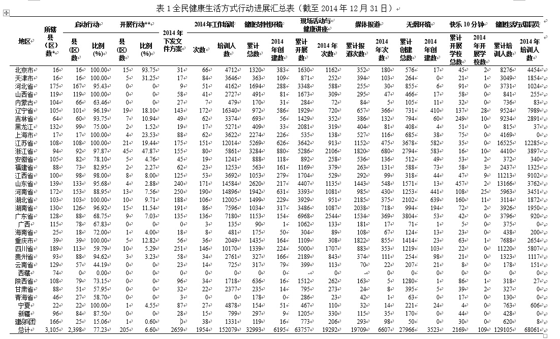 截至2014年12月31日,全国启动行动的县(区)数达到2401个,占全国县(区)总数的77.23%。按照疾病预防控制工作绩效评估标准(2012年版)要求,全国开展行动的县(区)数为205个,占全国总县(区)数的6.60%。全国完成各类健康支持性环境建设(健康社区、健康单位、健康食堂、健康餐厅/酒店、健康学校、健康步道、健康加油站/健康小屋、健康一条街、健康主题公园等)32989个,其中2014年新建成6191个。2014年全国利用全民健康生活方式行动日、高血压日、糖尿病日开展系列宣传活动和健康讲座次数共计19292次,媒体报道6607次。全民健康生活方式行动不断深入学校和社区,全国有2169所学校开展了快乐10分钟活动,全国培训健康生活方式指导员共129105名,其中2014年新招募68061名。2014年各省项目进展汇总数据见表1。