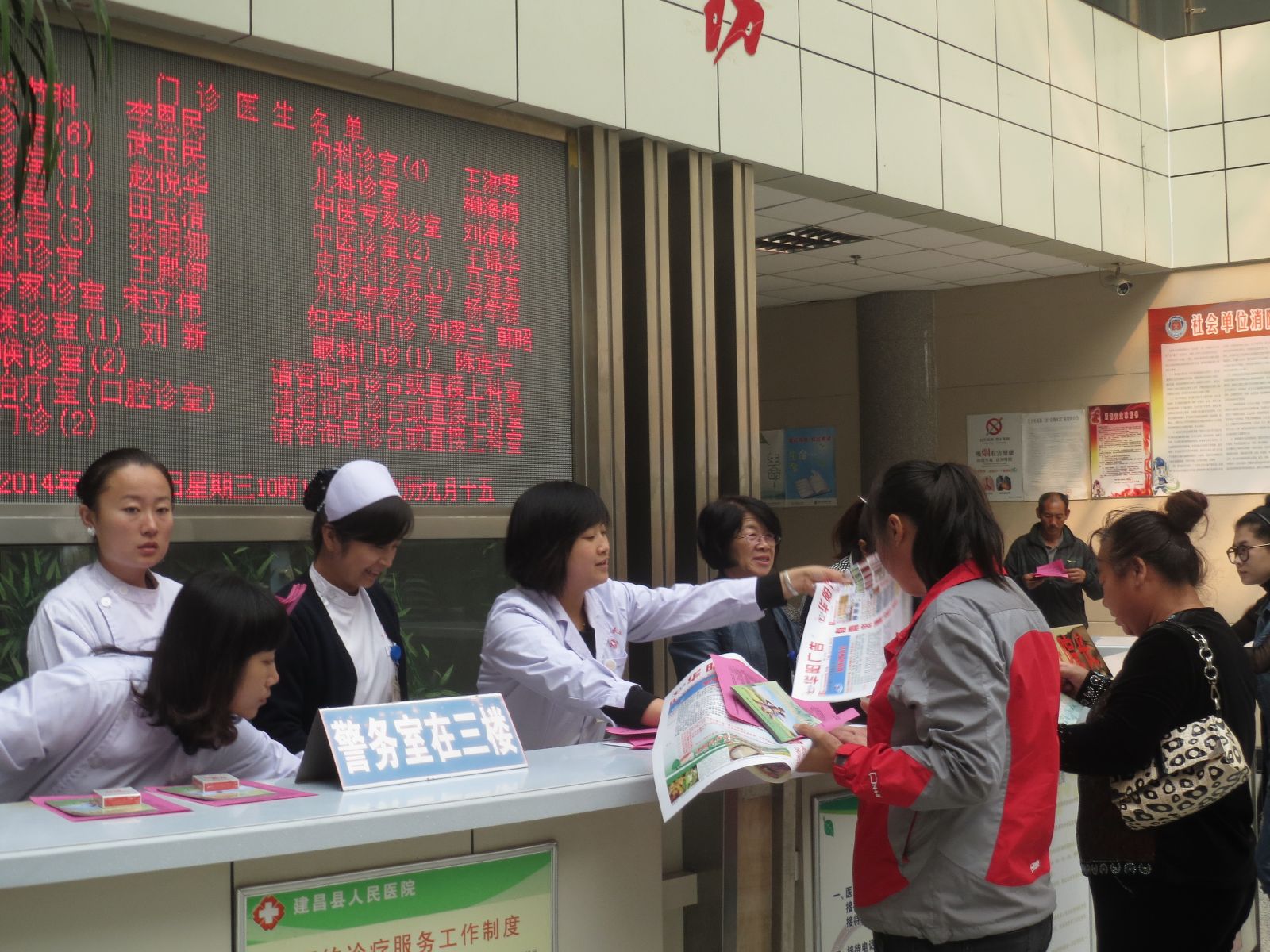 为迎来第17个全国高血压宣传日,葫芦岛建昌县疾控中心组织健康教育科和慢病科共同开展以'知晓您的血压“为主题的宣传活动,2014年10月8日上午9点30分建昌县疾控中心在镇内转盘街头、设立咨询桌、悬挂“知晓您的血压”主题语条幅,桌上摆放印有高血压知识的宣传单及华阳广告小报,公民健康知识读本,艾滋病知识扑克、圆珠笔等,向市民发放并讲解高血压知识。上午10点30分又到县第一医院门诊大厅和医院预防保健科共同向前来就诊市民开展了高血压知识宣传工作,通过这次宣传能让广大市民更深了解什么是高血压,知晓自己的血压合理用药,会减少心脑血管疾病和糖尿病的风险。本次宣传共发放高血压防控知识宣传单1000份,公民健康知识读本300份,艾滋病知识圆珠笔300支,印有高血压知识的华阳广告小报300张,前来咨询人员100人左右。