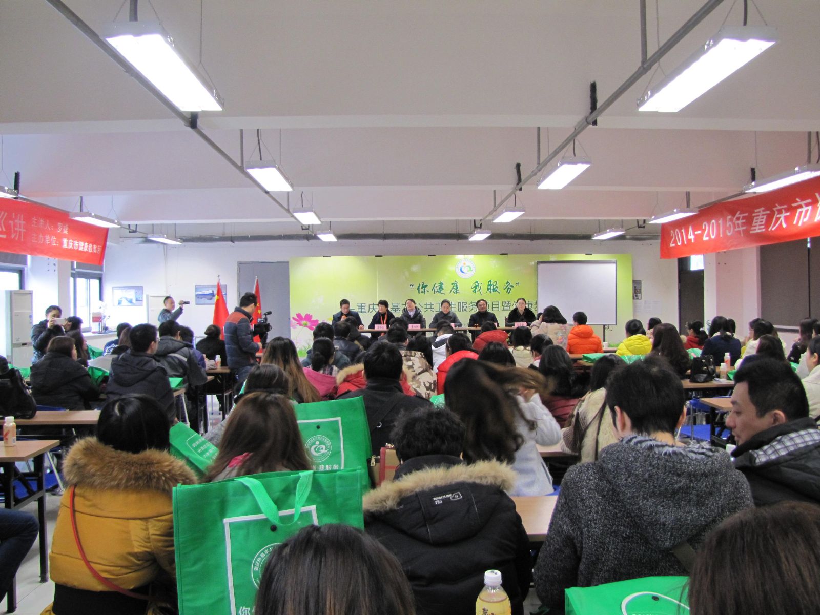 2014年12月16日,由重庆市卫生计生委主办、市健康教育所承办、渝北区疾控中心协办的“你健康,我服务”——基本公共卫生服务项目暨健康梦想课堂活动,在重庆轻轨集团童家院子轨道基地举行。首先,重庆市精卫中心副院长罗捷做了题为“缓解职场压力”的精彩讲座,获得轻轨集团员工的阵阵掌声。随后,渝北区疾控中心工作人员向重庆轻轨集团员工提供了基本公共卫生服务政策咨询服务,并发放了健康支持工具腰围尺、计步器各200余个。