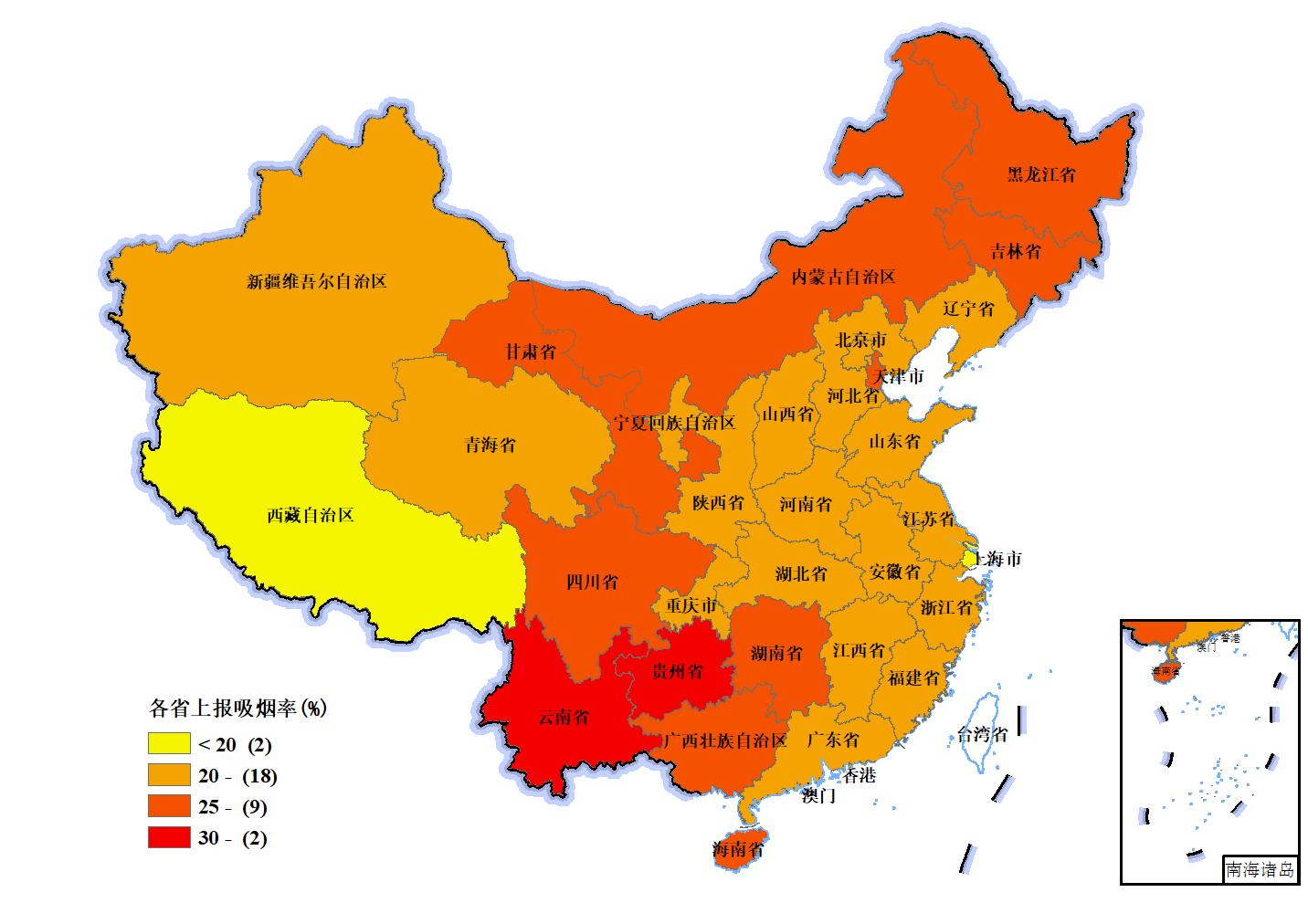 据各地成人烟草流行调查结果显示,2020年,上海市和西藏自治区15岁及以上人群吸烟率小于20%,云南省和贵州省高于30%。此外,18省份位于20%-24.9%之间,9省份位于25%-29.9%之间。
