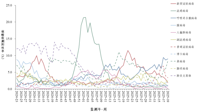 2025年第39周(2025年9月22日—9月28日),对全国哨点医院(不含港澳台)采集的门急诊流感样病例和住院严重急性呼吸道感染病例的呼吸道样本,开展新型冠状病毒、流感病毒、呼吸道合胞病毒、腺病毒、人偏肺病毒、副流感病毒、普通冠状病毒、博卡病毒、鼻病毒和肠道病毒等10种病毒以及肺炎支原体在内的多种呼吸道病原体检测。
