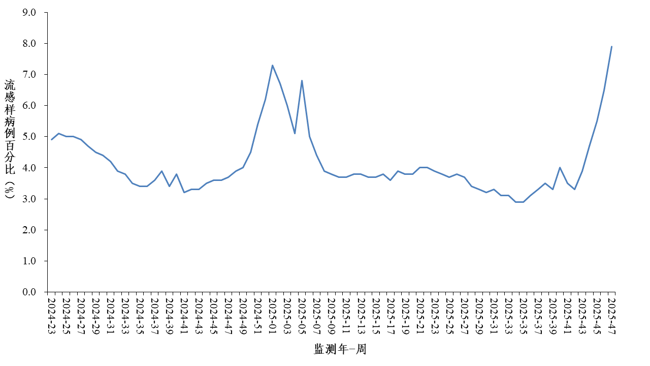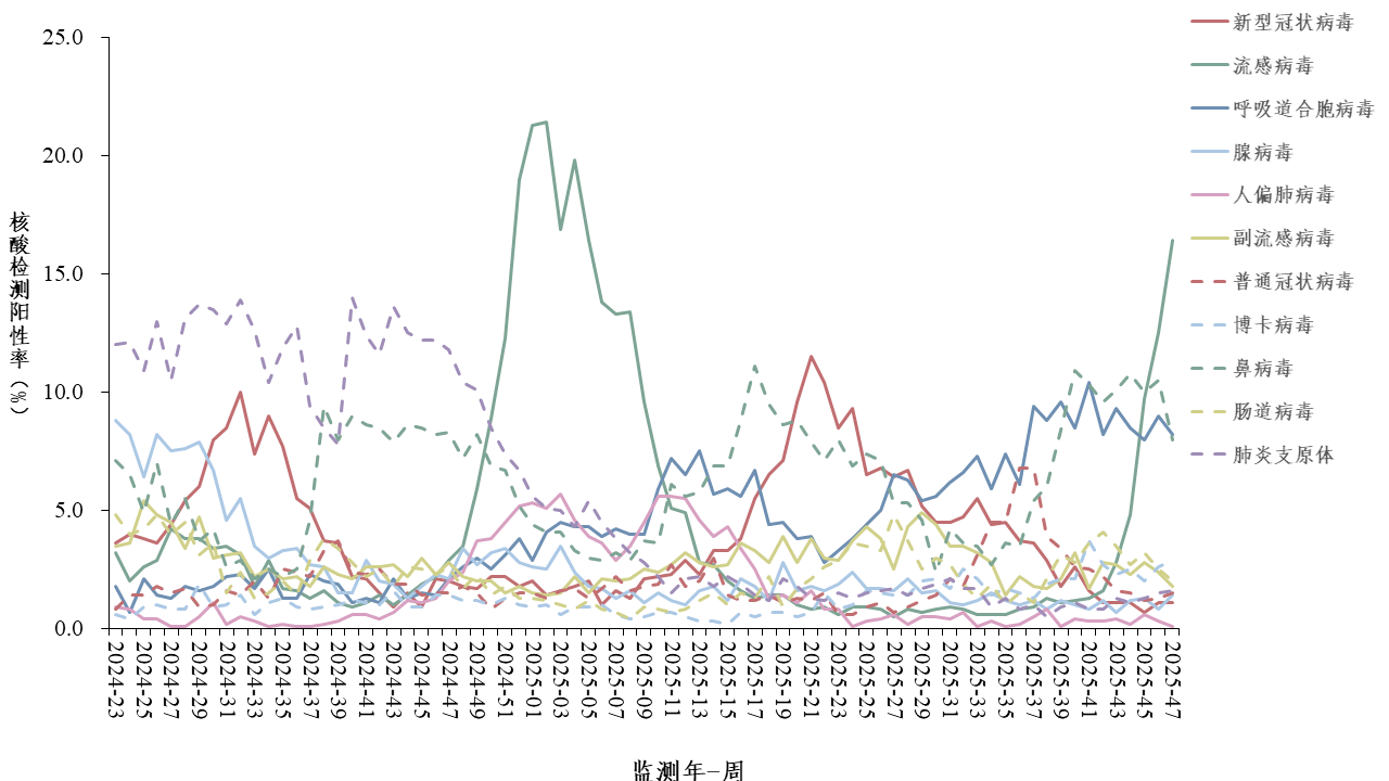 2025年第47周(2025年11月17日—11月23日),对全国哨点医院(不含港澳台)采集的门急诊流感样病例和住院严重急性呼吸道感染病例的呼吸道样本,开展新型冠状病毒、流感病毒、呼吸道合胞病毒、腺病毒、人偏肺病毒、副流感病毒、普通冠状病毒、博卡病毒、鼻病毒和肠道病毒等10种病毒以及肺炎支原体在内的多种呼吸道病原体检测。