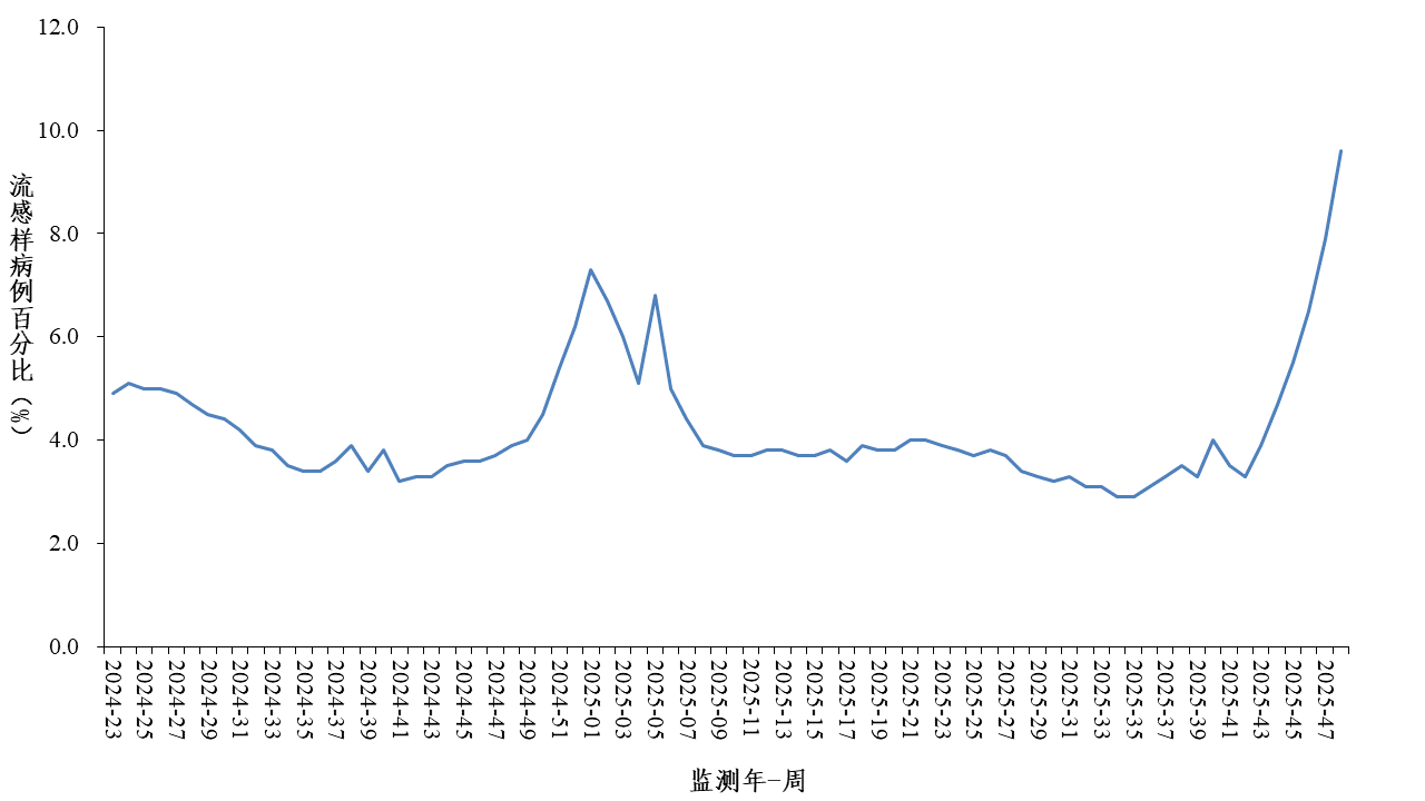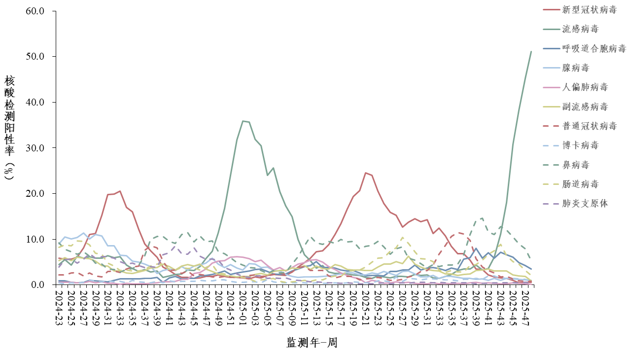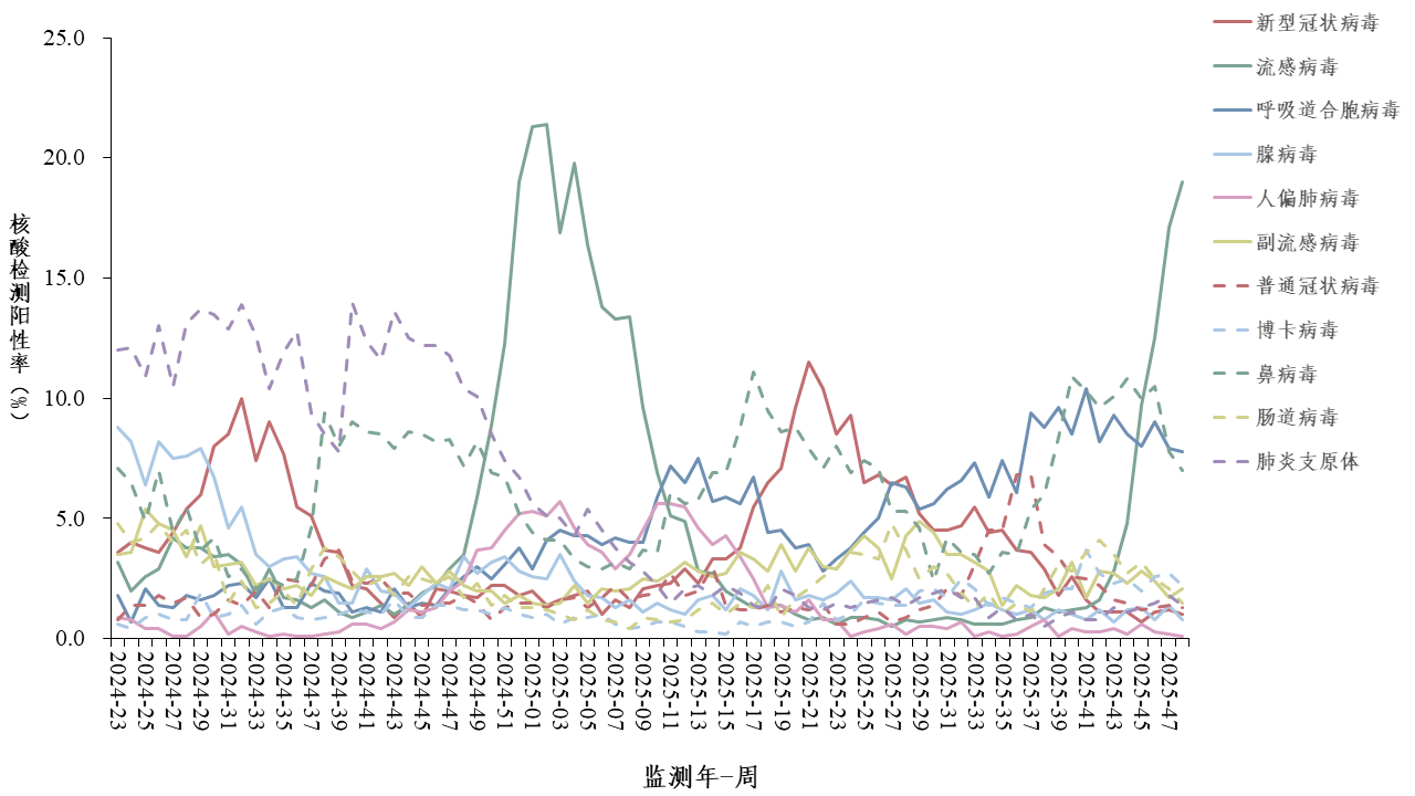 2025年第48周(2025年11月24日—11月30日),对全国哨点医院(不含港澳台)采集的门急诊流感样病例和住院严重急性呼吸道感染病例的呼吸道样本,开展新型冠状病毒、流感病毒、呼吸道合胞病毒、腺病毒、人偏肺病毒、副流感病毒、普通冠状病毒、博卡病毒、鼻病毒和肠道病毒等10种病毒以及肺炎支原体在内的多种呼吸道病原体检测。