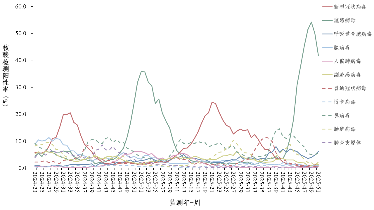 2025年第51周(2025年12月15日—12月21日),对全国哨点医院(不含港澳台)采集的门急诊流感样病例和住院严重急性呼吸道感染病例的呼吸道样本,开展新型冠状病毒、流感病毒、呼吸道合胞病毒、腺病毒、人偏肺病毒、副流感病毒、普通冠状病毒、博卡病毒、鼻病毒和肠道病毒等10种病毒以及肺炎支原体在内的多种呼吸道病原体检测。
