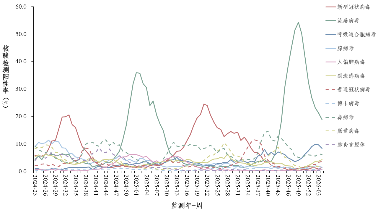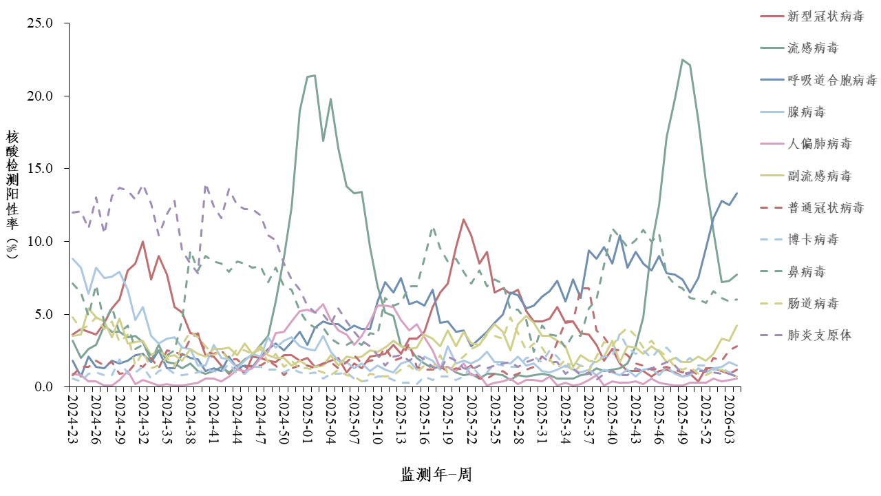 2026年第4周(2026年1月19日—1月25日),对全国哨点医院(不含港澳台)采集的门急诊流感样病例和住院严重急性呼吸道感染病例的呼吸道样本,开展新型冠状病毒、流感病毒、呼吸道合胞病毒、腺病毒、人偏肺病毒、副流感病毒、普通冠状病毒、博卡病毒、鼻病毒和肠道病毒等10种病毒以及肺炎支原体在内的多种呼吸道病原体检测。