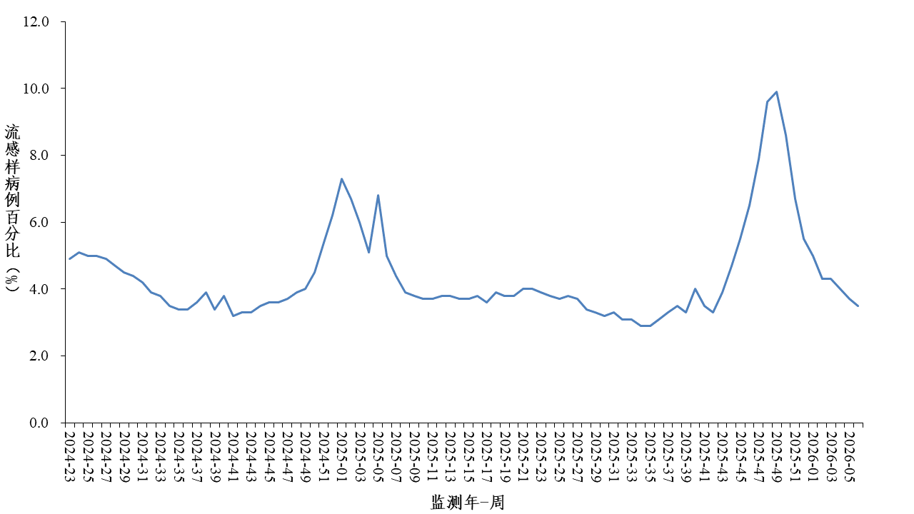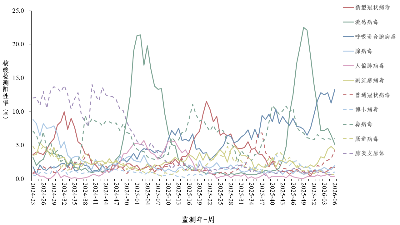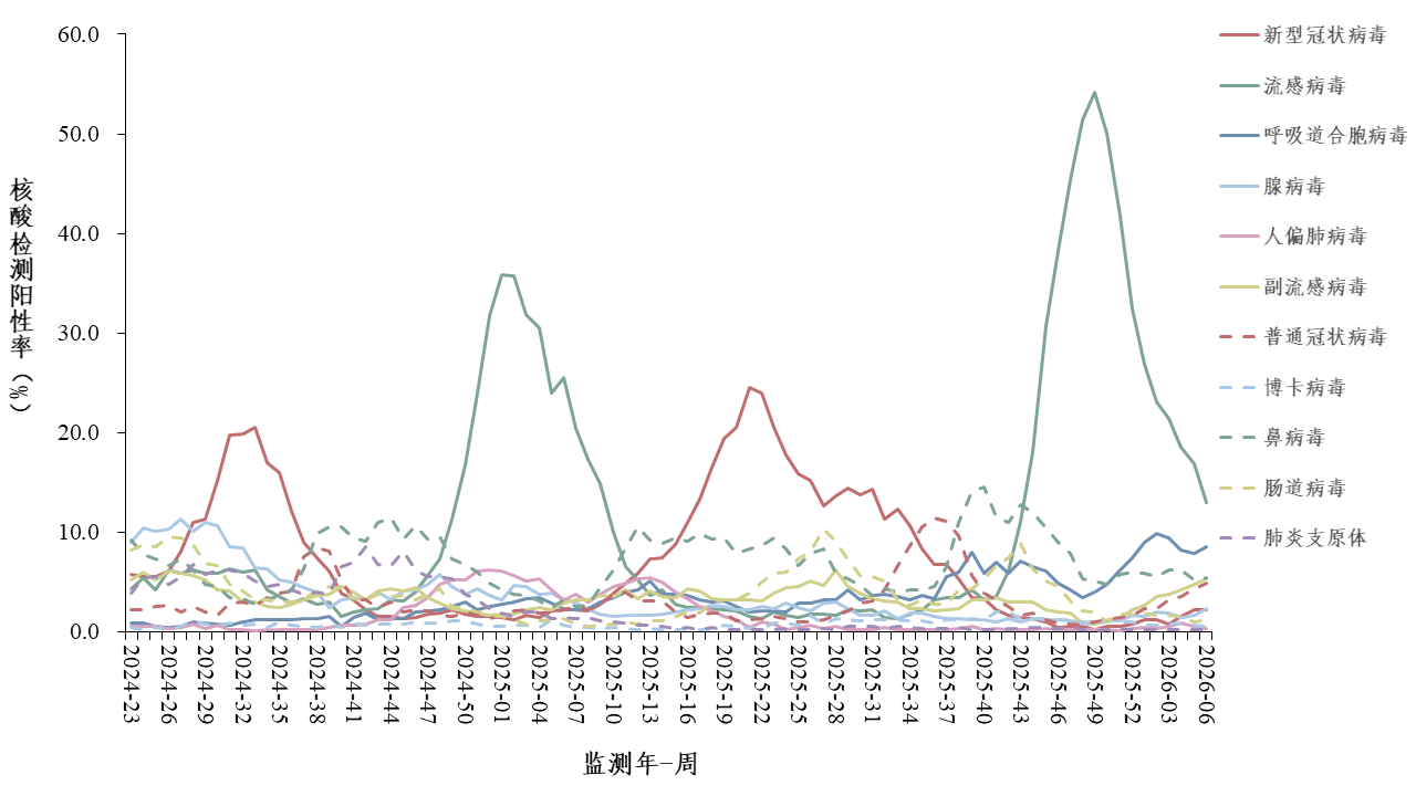 2026年第6周(2026年2月2日—2月8日),对全国哨点医院(不含港澳台)采集的门急诊流感样病例和住院严重急性呼吸道感染病例的呼吸道样本,开展新型冠状病毒、流感病毒、呼吸道合胞病毒、腺病毒、人偏肺病毒、副流感病毒、普通冠状病毒、博卡病毒、鼻病毒和肠道病毒等10种病毒以及肺炎支原体在内的多种呼吸道病原体检测。