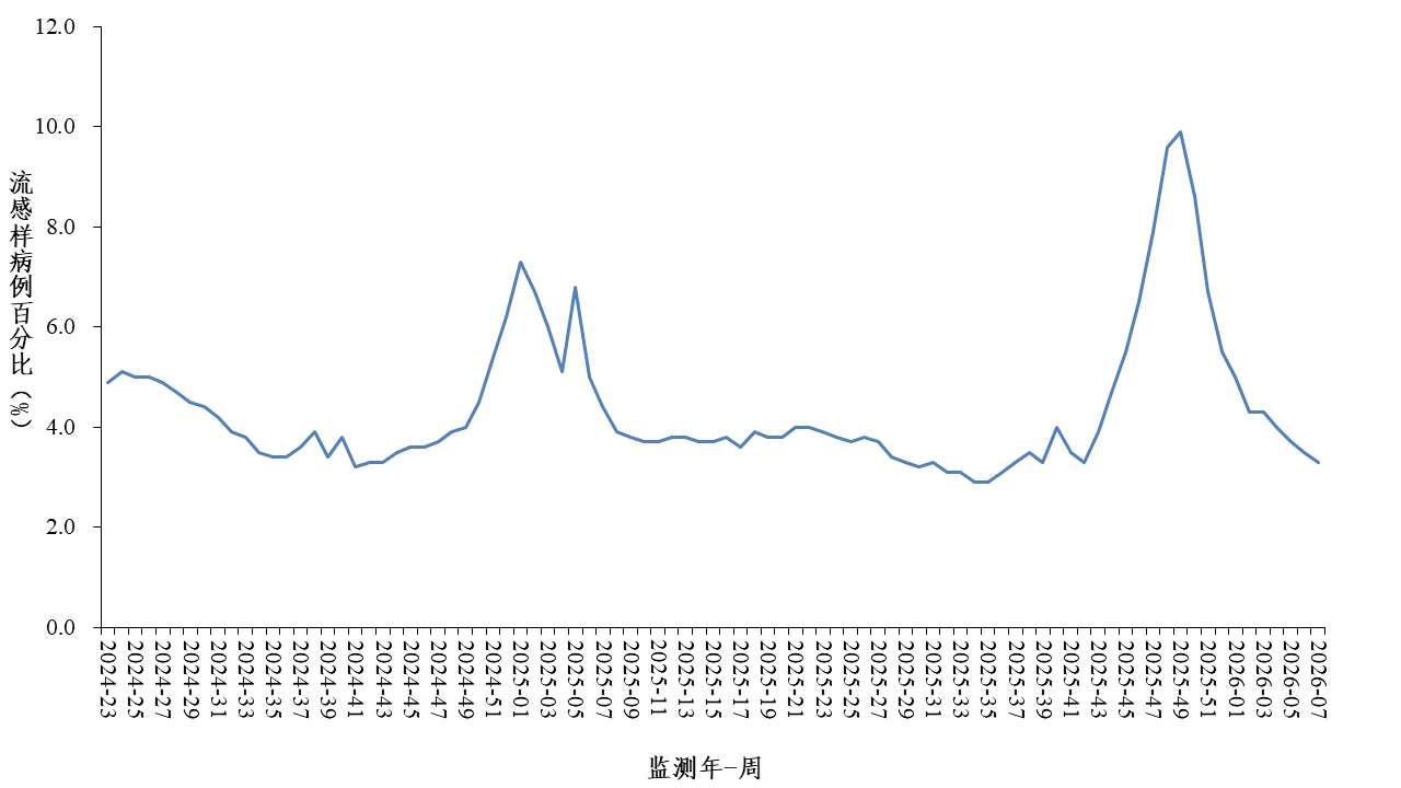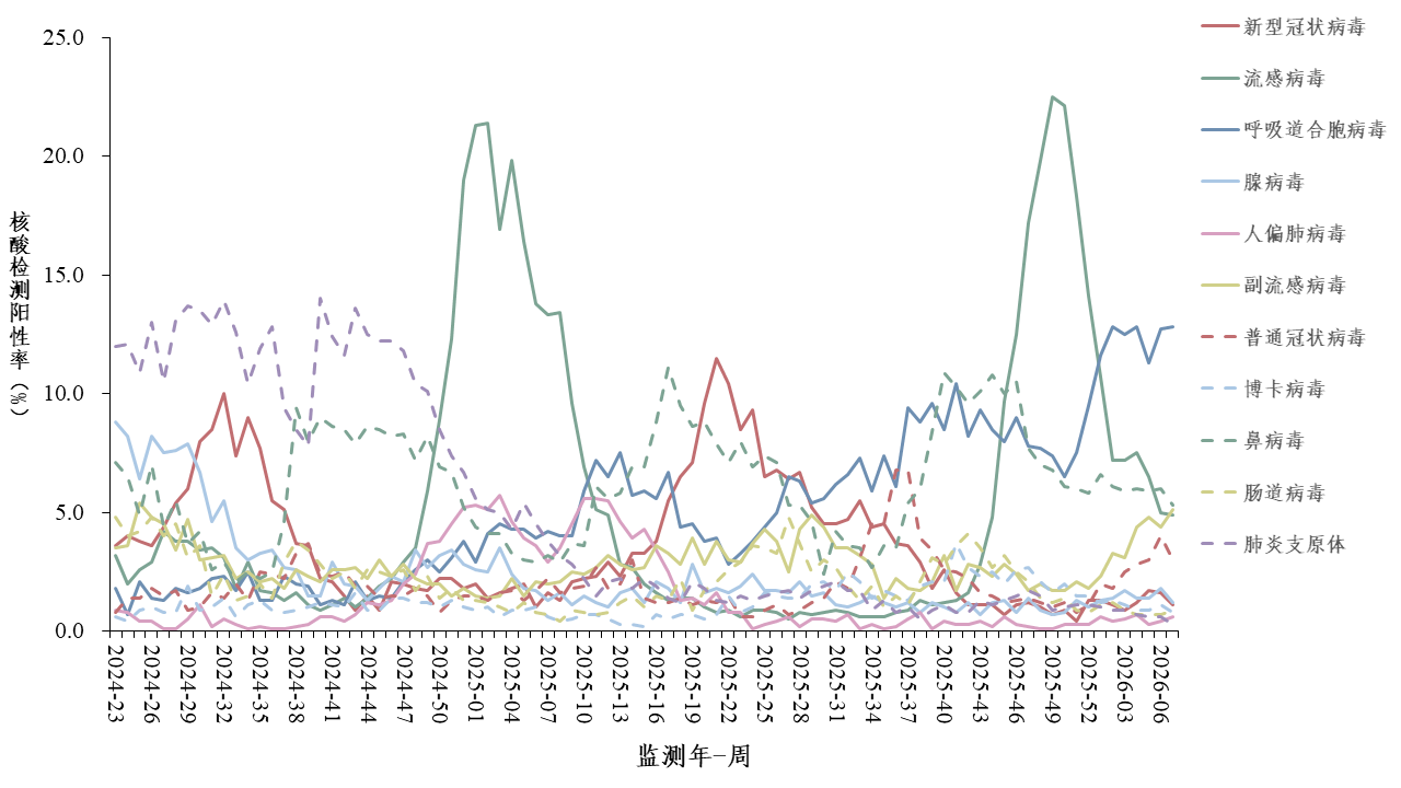 2026年第7周(2026年2月9日—2月15日),对全国哨点医院(不含港澳台)采集的门急诊流感样病例和住院严重急性呼吸道感染病例的呼吸道样本,开展新型冠状病毒、流感病毒、呼吸道合胞病毒、腺病毒、人偏肺病毒、副流感病毒、普通冠状病毒、博卡病毒、鼻病毒和肠道病毒等10种病毒以及肺炎支原体在内的多种呼吸道病原体检测。