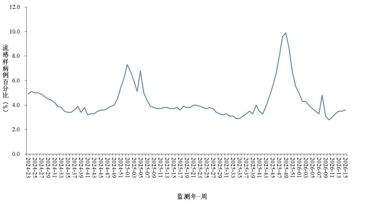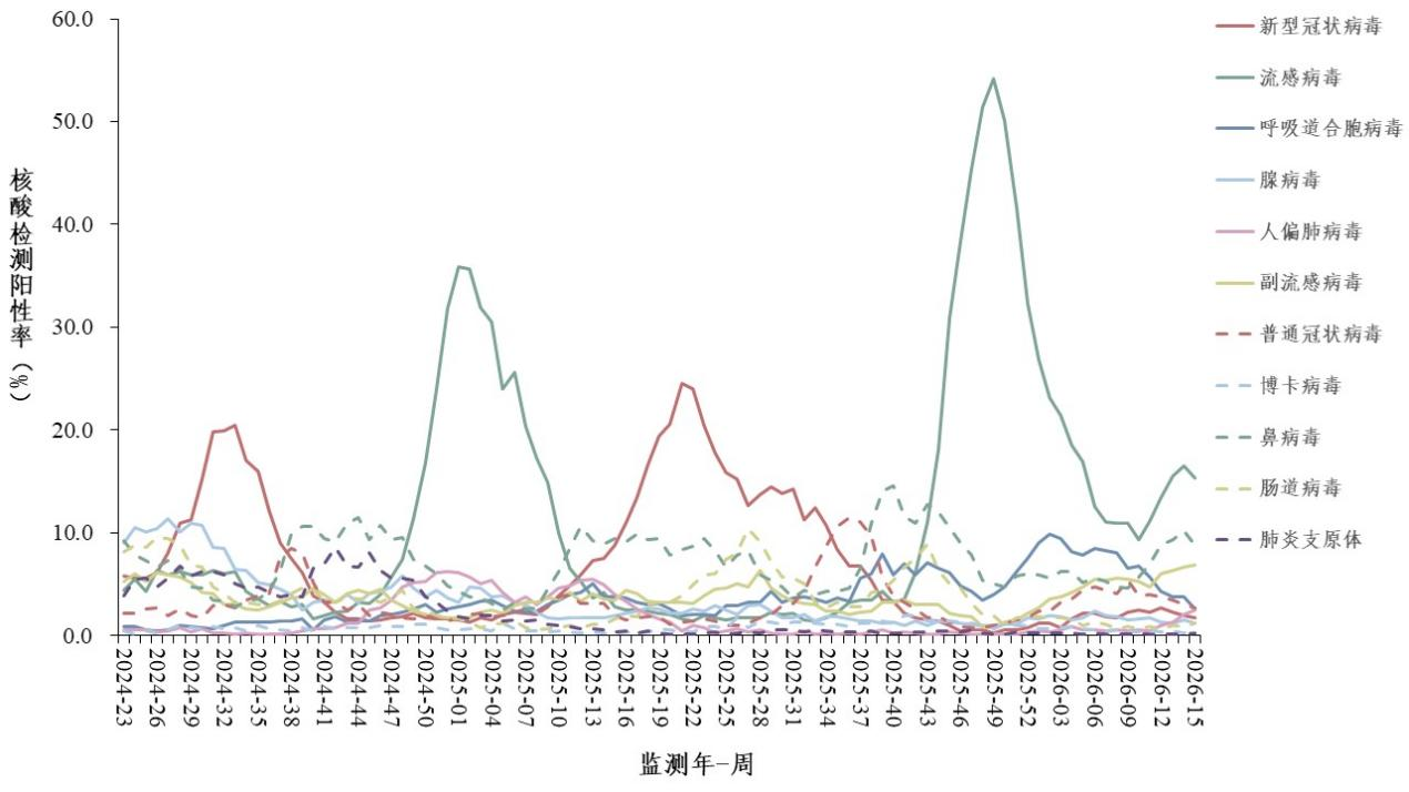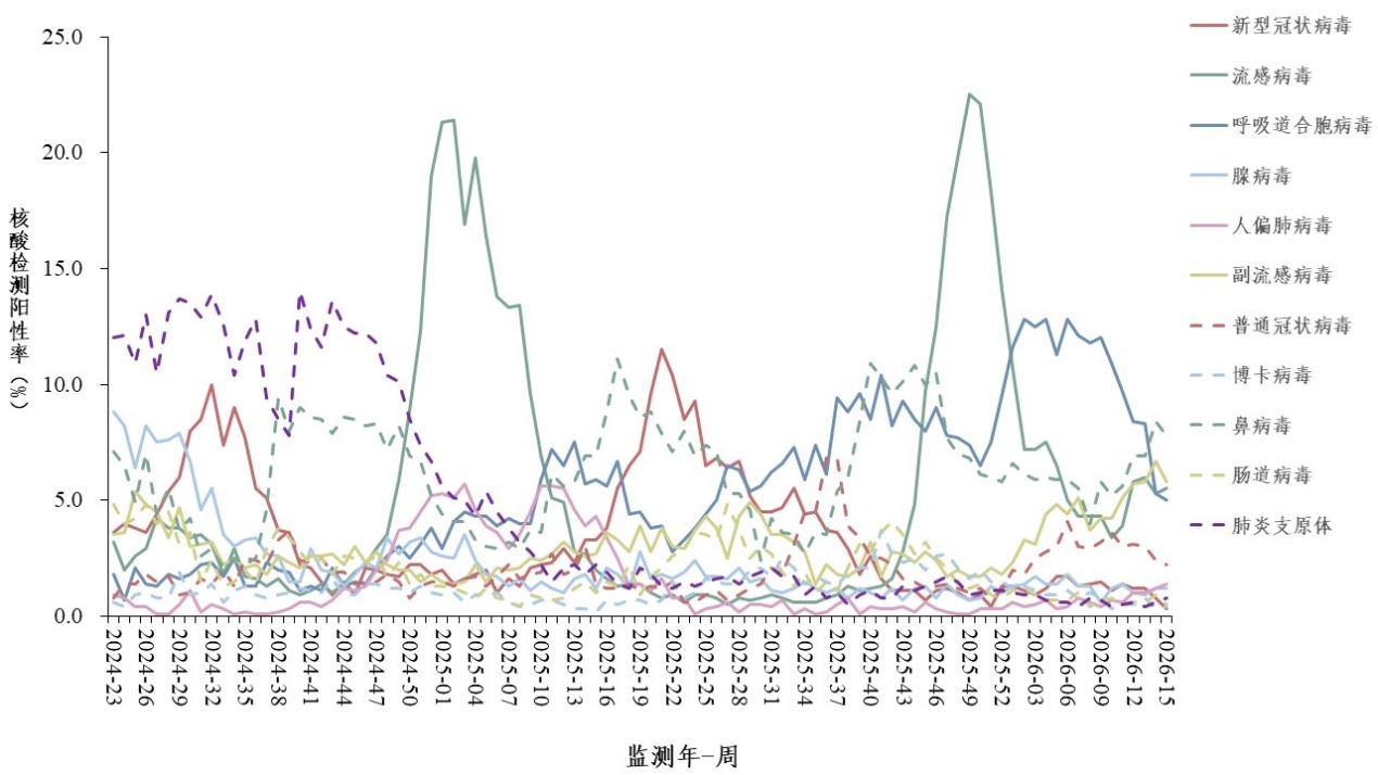 2026年第15周(2026年4月6日—4月12日),对全国哨点医院(不含港澳台)采集的门急诊流感样病例和住院严重急性呼吸道感染病例的呼吸道样本,开展新型冠状病毒、流感病毒、呼吸道合胞病毒、腺病毒、人偏肺病毒、副流感病毒、普通冠状病毒、博卡病毒、鼻病毒和肠道病毒等10种病毒以及肺炎支原体在内的多种呼吸道病原体检测。