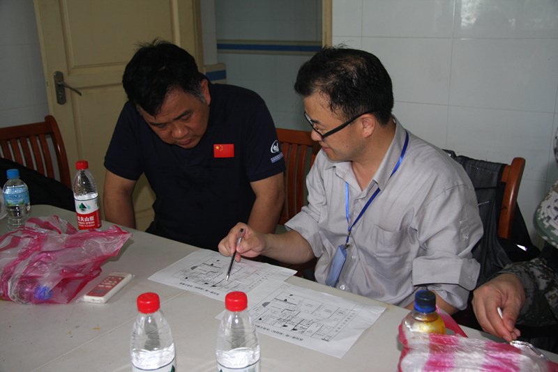 张流波研究员与赴塞检测队队长钱军一起讨论实验室改造方案