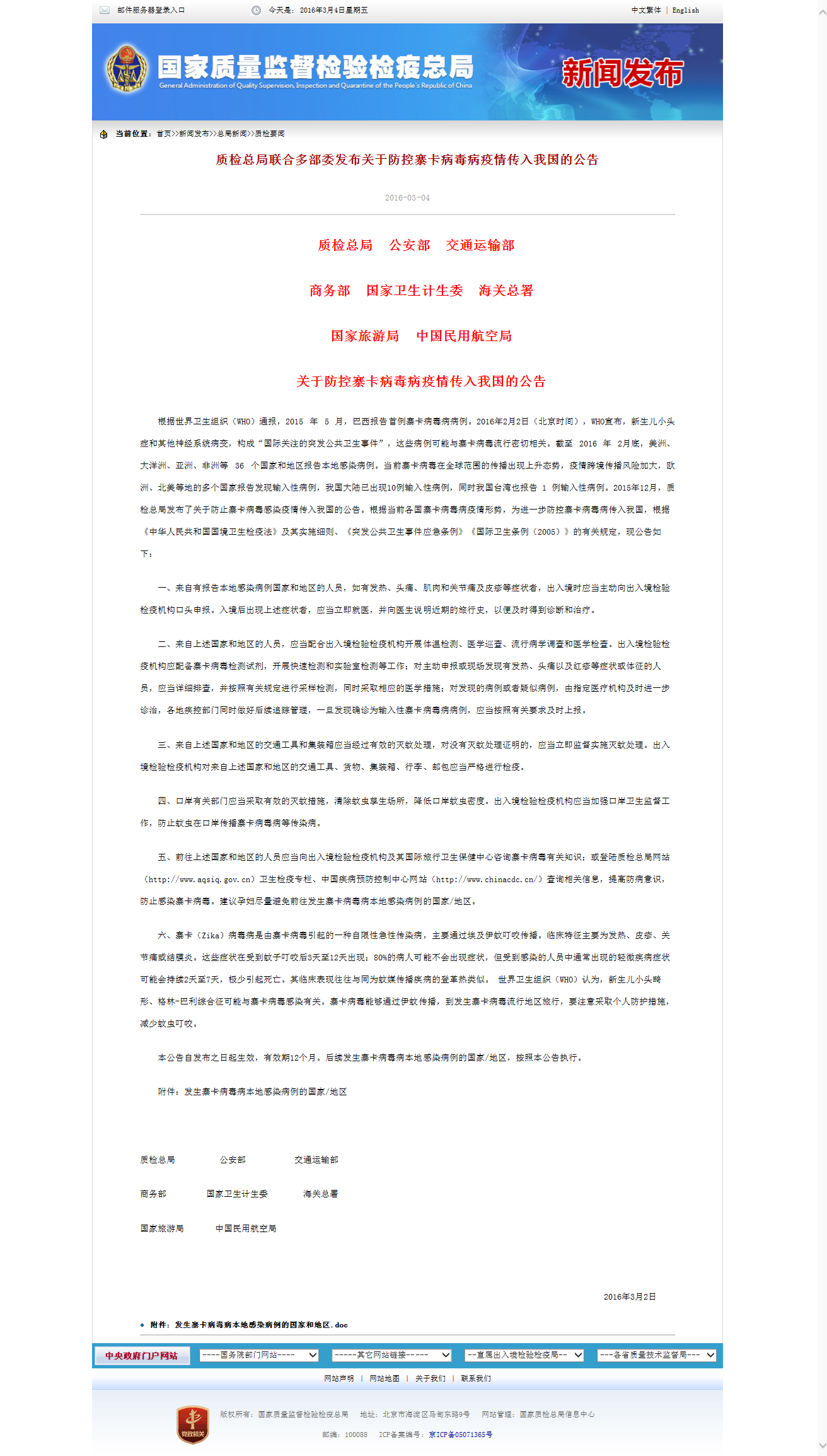 中华人民共和国国家卫生和计划生育委员会2016-04-01 国卫办疾控函〔2016〕311号 各省、自治区、直辖市卫生计生委,新疆生产建设兵团卫生局,中国疾病预防控制中心: 2016年2月,我委印发了《寨卡病毒病防控方案(第一版)》(国卫发明电〔2016〕4号)。为适应防控形势的变化,进一步做好防控工作,切实维护人民群众身体健康和生命安全,我委组织对此方案进行了修订,形成《寨卡病毒病防控方案(第二版)》(可...