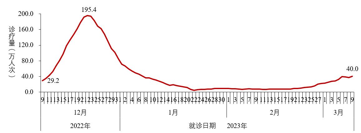 (三)城市发热门诊就诊人数结果。全国二级以上医疗机构和城市社区卫生服务中心发热门诊(诊室)就诊人数于2022年12月22日达到峰值195.4万人次,随后连续下降;1月23日后呈低位波动,近2周(2月24日-3月9日)呈波动增加,3月9日为40万人次,较峰值下降了79.6%(图2-3)。