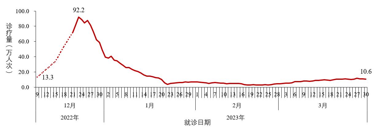 说明:自2022年12月9日起,监测二级以上医疗机构发热门诊诊疗量;12月21日起,增加监测社区卫生服务中心和乡镇卫生院发热诊室诊疗量(不含村卫生室和社区卫生服务站)。