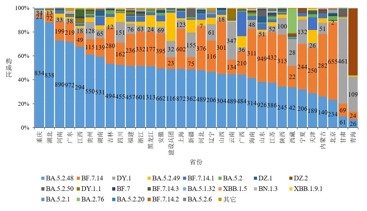 2.图中标记的数字分别为BA.5.2.48、BF.7.14、BA.5.2.49和DY.1进化分支有效基因组序列数量。