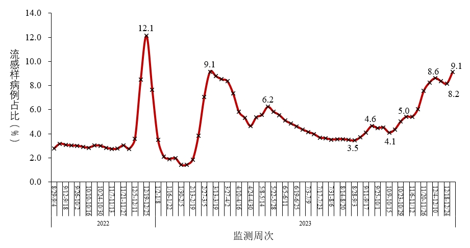 2023年12月1日-12月31日,全国哨点医院流感样病例占门(急)诊就诊人数比例从第49周(12月4日-12月10日)的8.6%下降至第51周(12月18-12月24日)的8.2%,第52周(12月25日-12月31日)小幅反弹至9.1%。见图3-1。