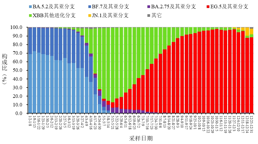 根据采样日期,XBB及其亚分支的占比仍然持续高位,JN.1占比呈现上升趋势。见图4。
