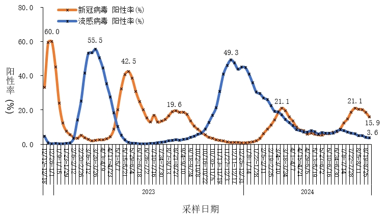 图3-2 全国哨点医院流感样病例新冠和流感病毒阳性率变化趋势