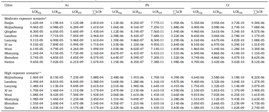表 不同城市0-5岁儿童暴露于As、Pb和Cr的致癌风险