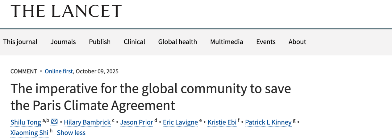 该研究由中国疾控中心、澳大利亚国立大学、美国华盛顿大学、波士顿大学和加拿大渥太华大学等机构合作完成,研究成果于2025年10月以“The imperative for the global community to save the Paris Climate Agreement”为题发表在柳叶刀(THE LANCET),中国疾控中心环境所童世庐教授为文章的第一作者及通讯作者。