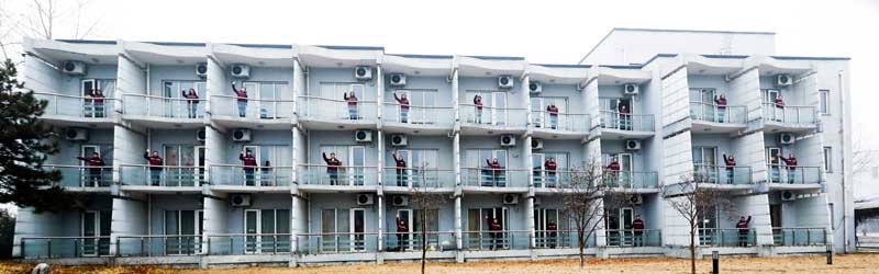 2月13日正月初三, 移动实验室核酸检测队全体队员在隔离点给大家拜年 摄影作者:传染病所 纪勇