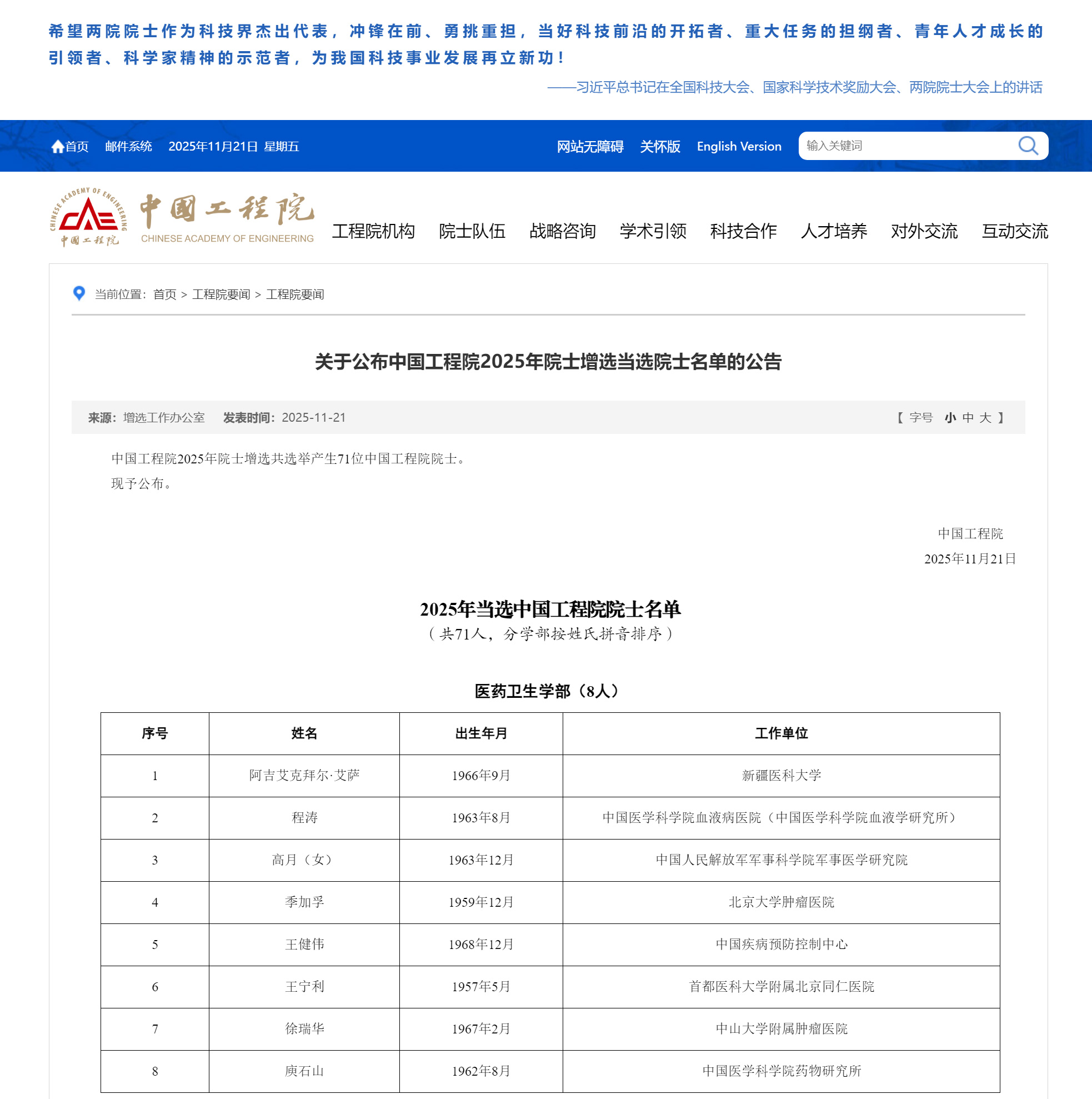 11月21日上午,2025年院士增选结果公布,中国疾病预防控制中心(中国预防医学科学院)王健伟研究员增选为中国工程院院士。